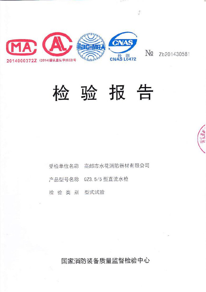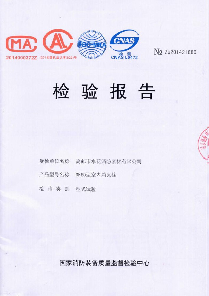 我廠創辦于一九七六年六月,現有職工600人,其中各類技術和管理人員68人。擁有固定資產5000萬元,占地面積35000多平方米,建筑面積25000多平方米。建立了完善的質量體系,取得多種“計量合格確認證書”,并成為江蘇及多省的消防協會會員單位。工廠技術力量雄厚,生產和檢測設備齊全,工藝先進。生產“水花”牌水帶接口: KDK65, KD65,KY65,KN65。消防水槍: QZG3.5/7.5, QZ3.5/7.5,QP8/0.7Z泡沫水槍。室內消火栓: SN65, SNW65-I,SNZ65, SNZW65-I。 消防軟管卷盤JPS0.8-19/25。生產的“郵花”牌,消防有襯里水帶:65-8、10、 13、 16、20、 25型; 80-16、 20、25型。水帶接口: KD50、65; KY50、65;KN65。消防水槍: Q2Z3.5/7.5、 5。 室內消火栓: SN65, SNW65-I, SNZ65, SNZW65-I。 并于二零一五年五月通過公安部消防產品合格評定中心3C換版檢驗,獲得以上產品所有的強制認證證書,準予生產和銷售,產品行銷全國各地,深受廣大用戶好評。